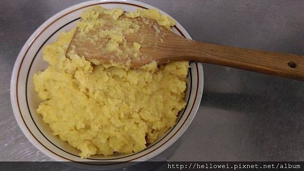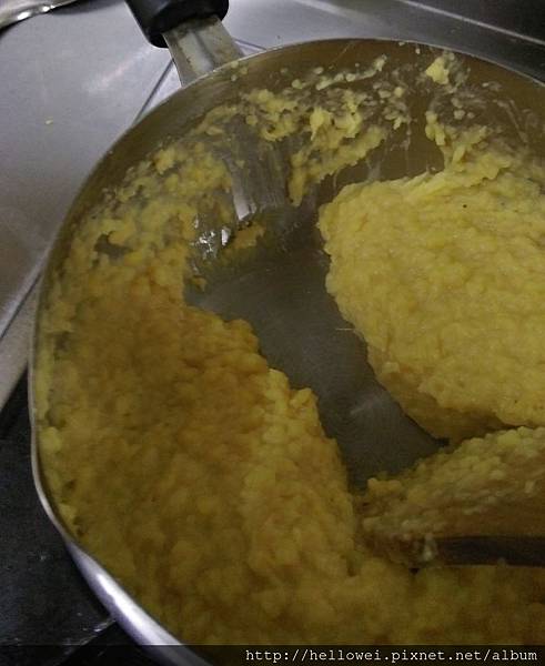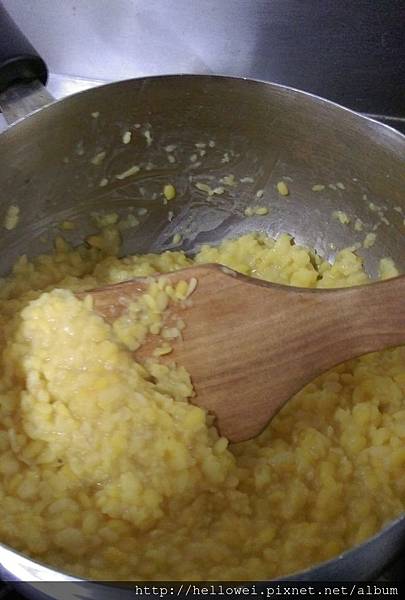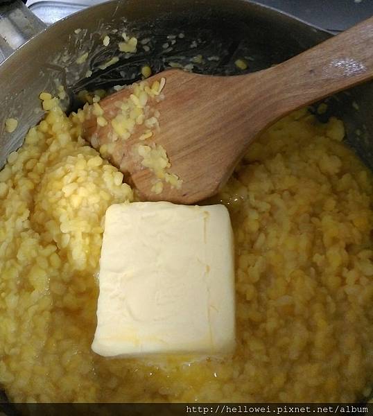 4.加入無鹽奶油,繼續小火慢攪,使兩者你儂我儂,忒煞情多