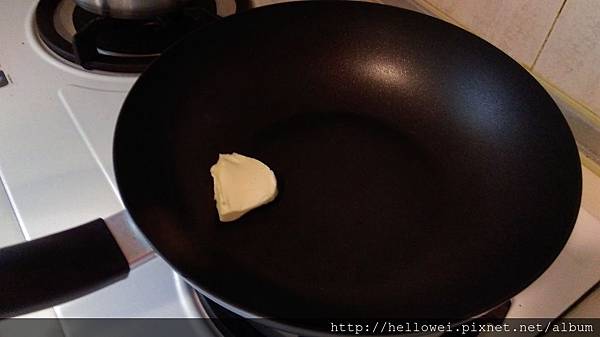 2.以一匙無鹽奶油,小火將蒜頭炒香