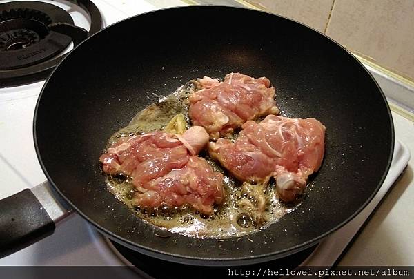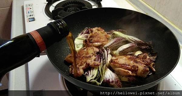 5.雞肉散發出香氣,呈微微焦黃樣時即可翻面,倒入Marsala酒