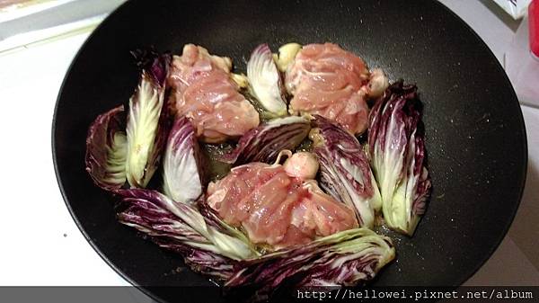 4.將切大塊的紅包心生菜(或其他蔬菜、菇類)放入一起煮入味