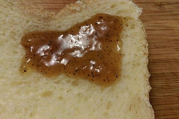 在綿軟的白土司上,可清楚看到茶葉碎片散布在柚子果肉中,